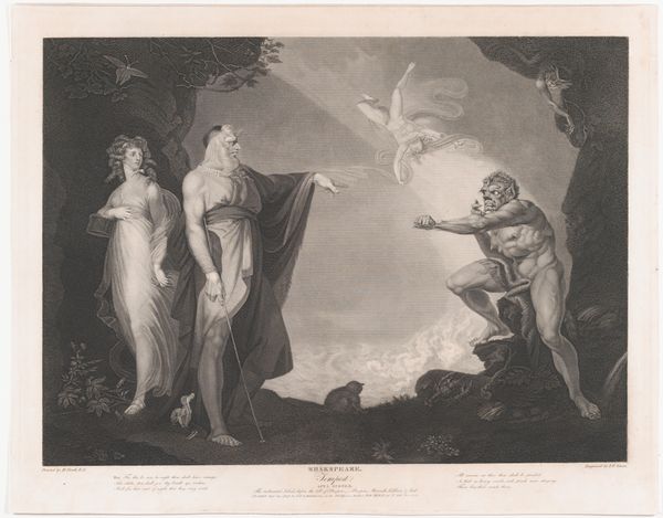 James Caldwall created this engraving, ‘The Witches Appear to Macbeth and Banquo,’ to capture a key moment from Shakespeare’s Macbeth. The stark contrast between light and shadow immediately draws our eyes. Caldwall uses dramatic lighting to highlight the figures. Notice how Macbeth, on the left, is bathed in light, emphasizing his muscular form and apparent strength. Banquo, in contrast, is partially obscured, perhaps foreshadowing his eventual demise. The witches themselves are ethereal, floating figures in the upper right, rendered with soft lines that contrast sharply with the defined musculature of Macbeth. The composition uses diagonals to create a sense of dynamic tension. Macbeth's raised arm and the line of the witches pull our eyes upward, while Banquo's gesture directs us back into the scene. The tonal range from deep blacks to bright whites enhances the dramatic effect. This manipulation of light and form underscores the play's themes of ambition, fate, and the deceptive nature of appearances. The formal elements of the artwork mirror and reinforce the underlying narrative.
