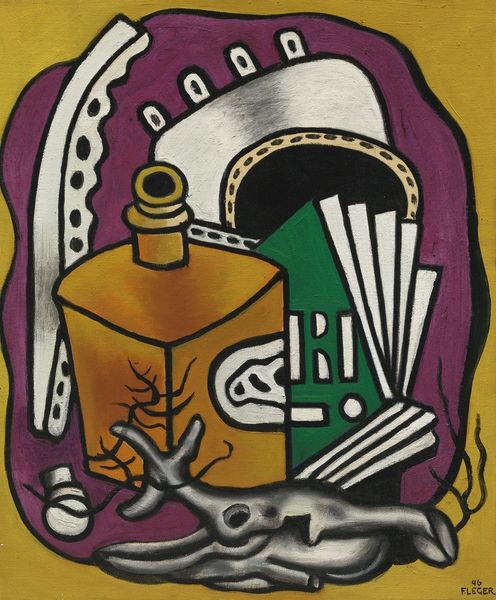 Curator: The flattened planes and bold outlines create a very direct visual experience, almost aggressively so. Editor: It’s intriguing how Fernand Léger renders ordinary objects with such precision in “La bouteille noire,” painted in 1951 using oil on canvas. We see a black bottle, a red container, even a vegetable peeler of sorts rendered with geometric certainty. Curator: It is this interplay between utilitarian items and how Léger elevates the process by bestowing dignity through careful brushstrokes. Note how he takes mundane tools and transforms them through art. I wonder how he considered their social role at the time. Were these elements used for mass production? Does it critique the onset of new consumption practices? Editor: It certainly speaks to the post-war optimism about domestic life, even a nod to industrial production which shaped new forms of urban existence in France. The still life as a format has historically affirmed stability. Yet Léger subverts this notion, right? Curator: Right! By applying avant-garde strategies of abstraction and rejecting the pictorial, he disrupts the very history that has legitimated this format. What can you tell me about its reception? Was the museum circuit keen to adopt Léger’s industrial still lives? Editor: Well, after the war, modernism and abstraction were increasingly embraced. Léger’s art offered a visually appealing but nonetheless revolutionary break from pre-war academic painting. It’s the accessible avant-garde. What do you make of Léger including the date when signing the painting? It gives it a sort of documentary quality, like marking the time of production itself. Curator: True! I suppose marking “51” situates the objects themselves historically and his own artistic processes with new practices around material culture. His work really insists on the handmade object but is always caught in relation to machines. Editor: Indeed. A compelling insight into a transitional period through objects we might otherwise overlook. Curator: An exploration that offers a modern-day glance into how production shaped visual culture in postwar France.