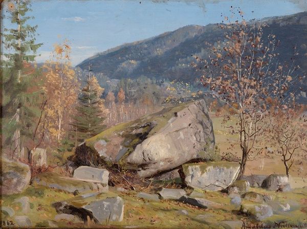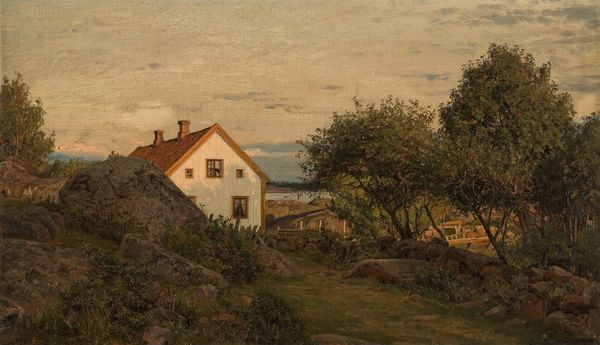 Amaldus Nielsen painted this landscape, ‘Ved Gjermundshavn, Hardanger’, using oil on canvas. Its composition is structured around a series of horizontal bands. The foreground, defined by its earthy tones and textured brushwork, gives way to the sharp blue line of the water. Above, the soft hues of the sky create a tranquil atmosphere, balanced by the dense greenery on the right. Nielsen masterfully balances realism with a sense of idealism. This division reflects a tension that was explored by artists and philosophers in the 19th century concerning humanity's place in nature. The careful arrangement of elements invites us to consider how we perceive and interact with the natural world. The detailed rendering of foliage contrasts with the broader strokes used to depict the sky, creating a visual dialogue between detail and abstraction. The interplay of light and shadow, color and form, draws us into a space that is both familiar and idealized. It's a reminder that art is not just about representation, but about exploring the structures that shape our understanding.