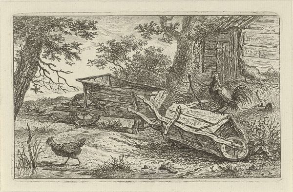 Jan van Huchtenburg created this etching, called 'Landscape with cart and figures', in the Netherlands, during the Golden Age. The image depicts a scene of everyday life, in which a group of figures, likely merchants or travelers, are resting with their horse and cart. As they pause on their journey, various social dynamics come into play, revealing the culture and values of the time. The figures in the landscape are arranged in a hierarchy. Those on horseback have a superior position to those resting on the ground. The presence of merchants and travelers reflects the importance of trade and commerce in the Netherlands during the Golden Age. To understand this artwork fully, one might research the economic and social history of the Netherlands during the Golden Age. This etching offers a glimpse into the daily lives and social structures of the past, as well as the era’s institutional and cultural norms.