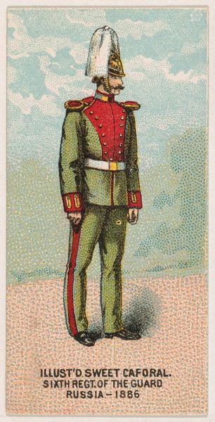 Editor: Here we have "Uhlan, Austria, 1850," a print from 1888 by the Kinney Tobacco Company. It’s part of their Military Series and was used to advertise Sweet Caporal Cigarettes. There's something very formal and a bit rigid about the pose and attire of the Uhlan soldier. What's your interpretation of this work? Curator: The Uhlan, a soldier in a meticulously detailed uniform, becomes a symbol beyond the individual. The uniform, the weapon, they evoke Austria's imperial past and military might. We see the weight of tradition. Note how the lithograph flattens depth, forcing us to confront the symbols directly. What emotions do the colours – the stark greens and reds – evoke in you? Editor: The green feels almost artificial, contrasting sharply with the red. It makes me think of propaganda. Curator: Precisely. This was not simply an image but a signifier, laden with coded messages about power and allegiance. Cigarette cards like these acted as mini-cultural textbooks. How does understanding its original context change your perception? Editor: It's no longer just a portrait; it's a carefully constructed piece of cultural communication designed to reinforce national identity. Curator: And remember, these images permeated everyday life. Each glance was a subtle reinforcement of a cultural narrative. It's fascinating how an everyday object like a cigarette card becomes a carrier of complex cultural symbolism. Editor: It definitely provides a new perspective to consider, how items we often disregard can have such rich hidden contexts. Curator: Indeed, and the careful use of symbols speaks volumes.