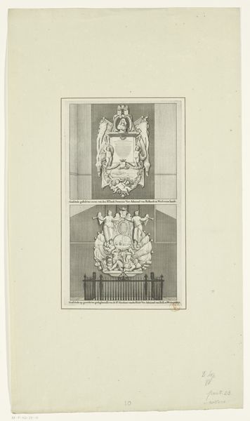 Curator: This etching, made in 1891 by NV Drukkerij G.J. Thieme, depicts the decorations erected for the visit of the German Emperor to Amsterdam. Editor: The formality is striking, like stage designs awaiting a royal entrance. There's an almost palpable sense of anticipation woven into the lines. Curator: Indeed. The composition adheres to neoclassical principles with its structured symmetry and the calculated arrangement of architectural elements. Observe the hierarchy created by the 'Princely Tent' at the top, leading down to the fountains. The precision in the etching technique gives everything a cool, formal appearance. Editor: The Imperial eagle, displayed prominently, suggests more than just a friendly visit; it’s about asserting power and influence. The banners and the sculpted fountains almost feel like a symbolic language, silently broadcasting a message of strength. It evokes a mix of pride and perhaps a little unease, given the context. Curator: The iconographic elements are deliberately chosen. Flags are always a fascinating, simple way to announce presence. Notice the decorative garlands and architectural frames are constructed in almost exaggerated detail using hatching, creating a spectacle out of what would be typical classic features. Editor: Considering the historical moment, with rising nationalism, how would Amsterdam's residents have interpreted all of these visual markers? Was it celebration, acquiescence, or perhaps a more nuanced mix of both? I can only imagine that it depended where they came from, politically speaking! Curator: Those interpretive angles are essential. While the artist shows us meticulously ordered displays of flags and fountain sculptures, he would inevitably rely on us to add meaning. To note is the graphic medium itself – an inexpensive means of reproduction allowing distribution, a kind of mass broadcast, ensuring a unified view. Editor: Exactly, a crafted visual narrative aimed at influencing public perception and promoting a specific ideological position through emblems, structure, and careful use of pictorial space. Fascinating how the design tells its own silent tale. Curator: It serves as a frozen moment in time, the study of which opens multiple possibilities, the essence of graphic art I would suggest. Editor: A powerful reminder of how art can serve as both a record and a carefully constructed representation of an era, thank you.
