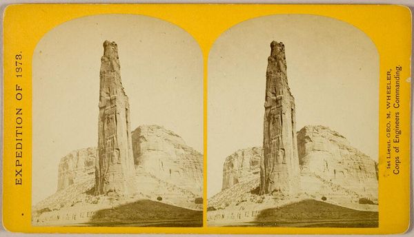 Curator: John K. Hillers’ stereo card, simply titled Rock Spire, offers a duplicated view of a monumental rock formation. The Harvard Art Museums hold this particular example. Editor: My first impression is one of stark, isolated grandeur. The spire dominates the landscape, a testament to geological time and force, but there is also something undeniably phallic about it. Curator: Yes, the spire carries echoes of ancient obelisks, symbols of power, fertility, and connection to the divine across cultures. Hillers' image captures its imposing presence. Editor: And that imposition, taken in the historical context of westward expansion, reflects power dynamics. Who is claiming and controlling this landscape, and at what cost to indigenous populations? Curator: The act of photographing itself was a claim, fixing a specific perspective. Hillers, working with the U.S. Geological Survey, participated in visually defining the American West. Editor: These images helped construct a narrative of manifest destiny, obscuring the violence enacted on the land and its original inhabitants. It's a complex visual inheritance. Curator: Indeed. It's a stark reminder of how images, even those seemingly objective, are imbued with cultural and political weight. Editor: An important perspective to carry forward when examining visual art.