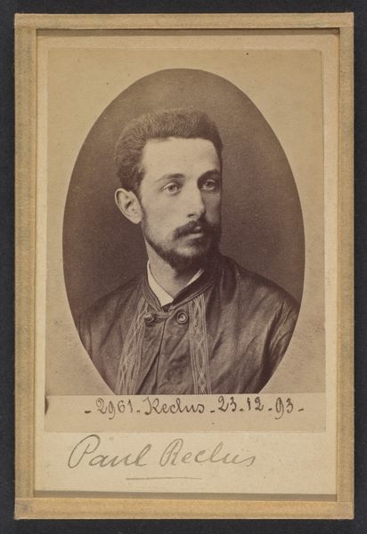 Editor: This gelatin-silver print, titled "Kern. Jacob, Hermann. 33 ans, né le 26/8/60 à Berlinger (Suisse). Comptable. Anarchiste. 10/7/94" and created by Alphonse Bertillon in 1894, feels incredibly stark. The man's direct gaze is unnerving, especially with the added text below the portrait that provides a snapshot of his identity: name, age, profession, and political leaning, as an Anarchist. What do you see in this piece? Curator: I see a document shaped by the intersection of state power and emerging photographic technology. Bertillon’s project wasn't merely portraiture; it was about crafting a system of surveillance, a means of control through the mass production and classification of images. Note the use of gelatin-silver print, a relatively new technology at the time, allowing for easier replication and dissemination of images. This speaks volumes about the institutional desire for efficiency in identifying and managing individuals deemed “deviant.” Editor: So you are saying the photograph served primarily as a tool to classify people? Curator: Exactly! Consider the meticulous detail in recording Kern's personal information. This isn't art for art's sake, but art as a function of a bureaucratic apparatus. The work reflects the larger social anxieties around anarchism at the time and the state's efforts to neutralize such threats through a systemized approach to tracking people. Also think about what the subjects in this new medium thought; the dynamic is as crucial to understanding the artifact as the final output itself. Editor: I see. So, it's not really about the individual, but the system that produced this image and what its use was? It sounds like an impersonal and extremely dehumanizing approach. Curator: Precisely. By focusing on the material process and the social context, we uncover a critical commentary on power, control, and the objectification of individuals within systems of governance. This portrait embodies the anxieties of an era grappling with rapid social and technological change. Editor: That gives me a completely different perspective. I'll definitely consider all of that next time I look at it.