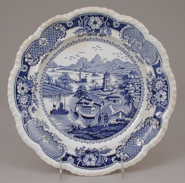 Curator: Here we have a plate dating back to 1737, an exquisite piece of earthenware currently residing here at the Minneapolis Institute of Art. The maker of this artwork remains anonymous. Editor: My first impression is one of serene detail. The cobalt blue on white is classically elegant, but the octagonal shape gives it an interesting edge. There’s so much miniaturized visual information. Curator: Indeed, it's quite telling how even common household objects became vehicles for propagating specific aesthetic values. The landscapes, inspired by Asian art, signify more than mere decoration; they were potent signifiers of cosmopolitanism. They speak to a world of luxury that became entangled with colonial ambition. Editor: I notice the scene unfolds in a continuous circular band within the center of the plate. Birds fly about freely over a pagoda nestled near some strange rock formations. What's the significance of featuring those pagodas so prominently? Curator: They are less literal architectural representations, and more emblems appropriated from chinoiserie designs—European interpretations and fantasies of Chinese aesthetics that circulated during the period. These were immensely popular. These romanticized visions contributed to a perception of the "Orient" filtered through a European lens, influencing trade, politics, and social relations. Editor: So, even in a piece as seemingly benign as this, we observe complex interactions of cultural exchange and the assertion of a certain European identity. The simple act of dining is, then, subtly infused with statements of global reach. Looking closely, the way that cobalt glaze pools in certain areas creates such beautiful variations and depth in the linear details. Curator: Precisely, even this sort of seemingly harmless piece of decorative art underscores the intricate webs of intercultural encounters and, yes, sometimes also exploitative trade dynamics inherent to its moment in time. It speaks volumes if we listen. Editor: Thank you, I didn’t consider how objects we interact with every day serve as tangible, accessible reminders of power and the legacy of those relationships, both here in museums and perhaps even at home on our walls or shelves.