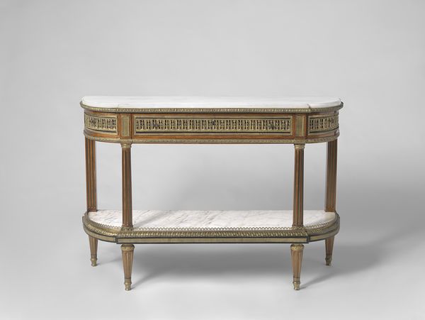 Editor: Here we have a penant table made around 1785-1790 by Johann Gottlieb Frost. The materials include wood and metal, and the piece has a double half-oval marble top with a gallery. The overall design looks light and airy. It is amazing to see such delicate features on a table! What do you see in this piece, especially considering the period? Curator: Ah, yes! I am immediately transported to a salon, powdered wigs and hushed conversations, don't you think? For me, it whispers of Neoclassical aspirations – a desire to return to the "purity" of classical forms, but reinterpreted through the lens of late 18th-century refinement and a hint of whimsy, visible especially in the fluted legs and the gallery detailing around the marble tops. Do you get a sense of that striving for perfect proportion? Editor: Yes, I see what you mean about striving for perfect proportion, especially when you point out the fluted legs! I initially overlooked the small details but it really is so thoughtfully made. Are there other reasons you refer to the piece's "purity"? Curator: Well, I think the restraint in the decoration, compared to the exuberance of the Rococo style that preceded it, is significant. Also, consider the materials: the cool marble juxtaposed with the warm wood. It's a balanced dance between extravagance and understatement, like a subtle burn. It makes one think if Frost did it intentionally! What about you? Editor: Now that you mention it, the subtle details like that interplay between marble and wood definitely speak to a restraint I did not pick up at first. This certainly isn’t the heavy, gilded furniture that comes to mind when I think of that era. The table feels fresh in some ways. Curator: Fresh is a beautiful way to put it! It suggests a lightness of touch and spirit that I admire, making the table a fascinating expression of transition in art and society. Editor: I agree completely! Thanks for your insight, I appreciate your making visible what went unseen!