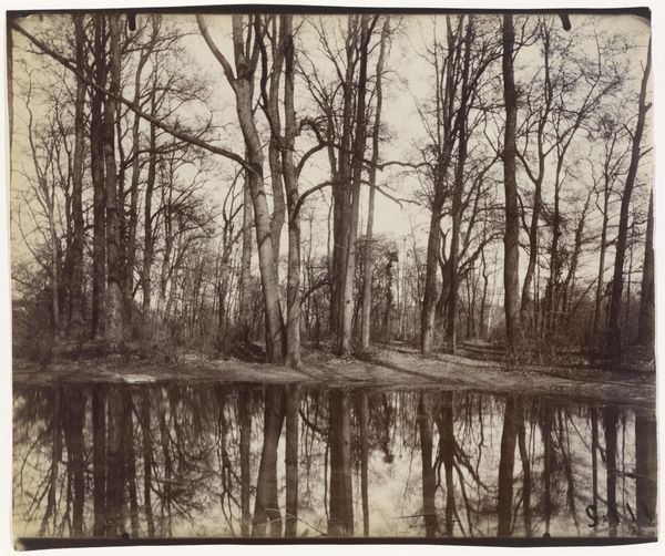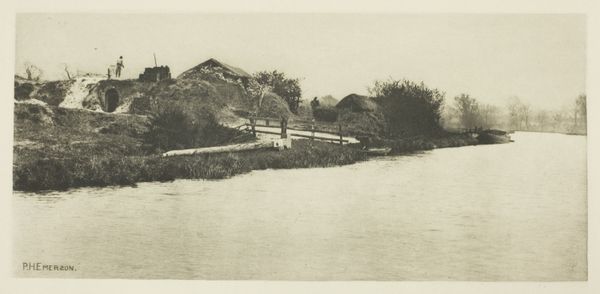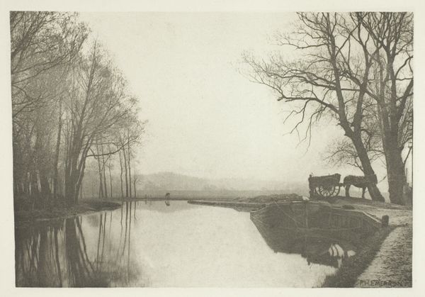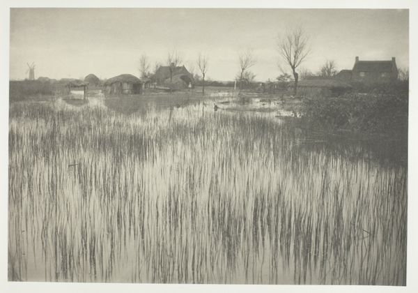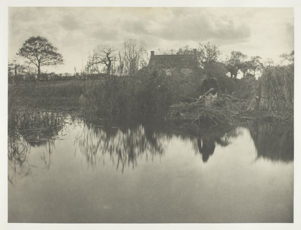 Editor: This is "The Gladdon-Cutter's Return" by Peter Henry Emerson, created in 1886. It’s a photograph, and looking at it, I’m struck by the starkness of the landscape, this overriding somberness. What formal elements stand out to you? Curator: Note the careful tonal gradation Emerson achieves through photography. The composition is divided into distinct zones, from the dark foreground to the lighter background, which provides a structural balance, does it not? Editor: It definitely feels very intentional, not just a snapshot. Are there other aspects to how he structured the photo? Curator: The use of receding planes creates depth, but, paradoxically, also flattens the image. Consider the textures: the water, the reeds, the wooden boats. How do these varied surfaces affect the visual reading? Editor: The reeds offer a linear contrast to the water, almost like visual static. And then the boats echo the human form. Is he intentionally mirroring man and machine here? Curator: Perhaps. Observe how the tonal relationships dictate our focus, from the detailed reeds to the soft rendering of the background trees, how it all holds together in a web of shapes. Does this clarity amplify or diminish the experience? Editor: It feels enhanced, everything feels essential and thought out. It pulls you in and almost holds you there, studying it all. Thanks for highlighting these aspects! Curator: My pleasure. By studying its structure, we access a richer viewing, beyond subject or circumstance.