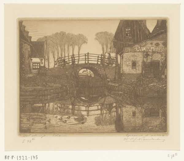 Anton Koster made this etching of a watermill in the Netherlands, likely in the late 19th or early 20th century. It's easy to romanticize such a scene, but the watermill was, above all, a place of work. Note how Koster emphasizes the mill's integration with the natural world, almost as if it's growing out of the landscape. This was a period of rapid industrialization, and many artists responded by idealizing rural labor. The etching technique itself, with its emphasis on line and texture, lends itself well to capturing the rough surfaces of the mill and the surrounding foliage. To fully understand this image, we might look at the changing economics of milling in the Netherlands, as well as the rise of artistic movements focused on landscape and rural life. We might also consider the role of institutions like art academies and the market for prints in shaping Koster's artistic choices.