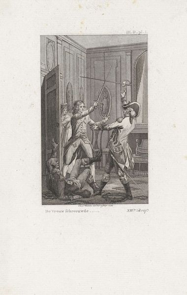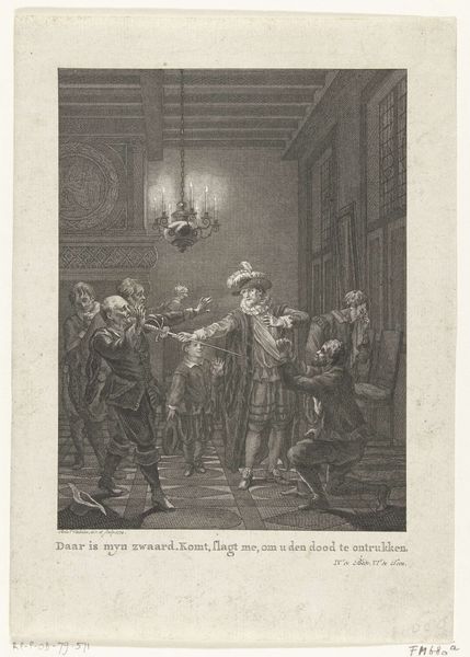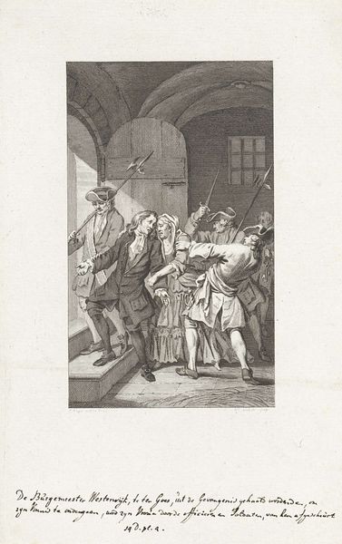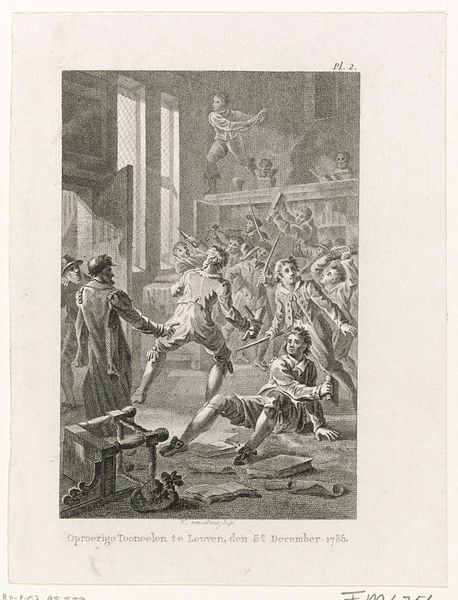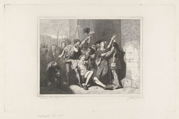 Jan Frederik Christiaan Reckleben created this print, “Attack on William of Orange by Jean Jaureguy, 1582,” sometime in the mid-19th century. A flurry of grey and white activity surges towards us, the cross-hatching of the print creating a sense of depth that pulls us into the conflict. The composition divides into three distinct zones: the foreground where the fallen assassin lies, the jostling middle ground, and the distant background of onlookers, all framed by the archways of the building. Reckleben employs line and shadow to focus our attention on the figures surrounding William, creating a dense knot of action and reaction. The print's formal structure offers a reading of power and chaos. The stark contrast between light and dark emphasizes the drama of the moment, but also suggests a deeper structural tension. By emphasizing the inherent drama through the arrangement of shapes, the composition engages in a discourse about historical violence. The structural patterns reveal power dynamics within the narrative, where chaos is both a consequence and an expression of conflict.