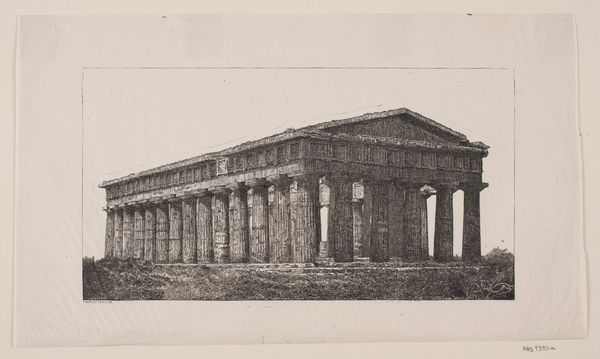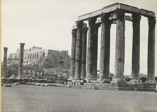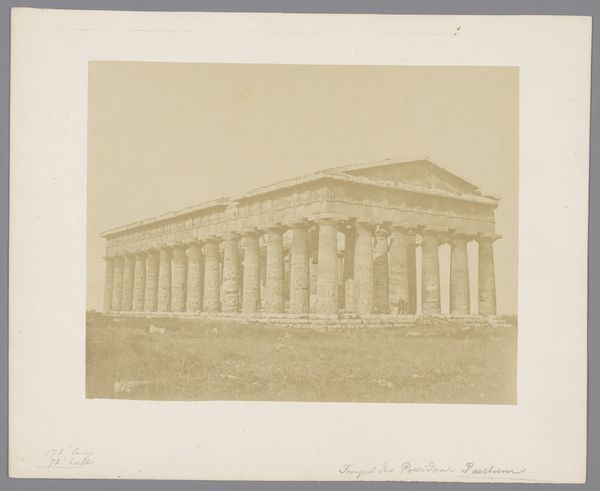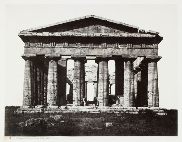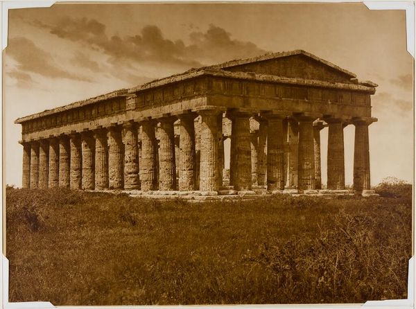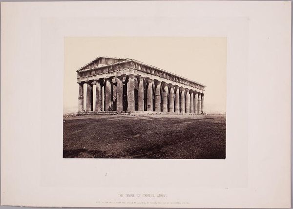 Curator: Oh, it’s breathtaking! This photograph captures the Temple of Hephaestus in Athens. It’s an albumen print, created around 1880-1890 by the Rhomaides Frères. There’s a certain grandeur and melancholy in its monochrome tones, isn’t there? Editor: Grandeur, yes, undeniably. Melancholy... Perhaps it’s the sepia wash, a beautiful antique feel to it. It feels stoic, resolute – a kind of visual elegy to a lost world. The weight of history, quite literally. Curator: Precisely. The Rhomaides brothers were masterful at capturing these archaeological sites. Look at the fluted columns, the Doric order still so distinctly preserved after all this time. The clarity with which the architecture is presented is just amazing, allowing us to study these ancient construction methods, even though it’s only a photograph. Editor: And it's more than "just" a photograph. It’s a deliberate act of cultural preservation. Consider what the Temple represents – Hephaestus, god of metalworking, craftsmanship. That connects directly to the photographic process itself. Turning light and chemistry into something permanent. In a sense, it is itself, a forging. Curator: Ah, a forging of light! That's wonderful. It’s about how we engage with memory, right? I think these photographs offered a way for Europeans in the late 19th century to connect with their classical heritage. Nostalgia sells! Editor: Nostalgia, and a potent sense of self. The image of the temple here, with its almost severe clarity, symbolizes rationality, order, the foundations of Western thought. It’s a romanticized version of history, definitely, but one that shaped the cultural and intellectual landscape. Curator: True, these images are infused with a certain idealized classicism, not a raw depiction of antiquity. I find it interesting to think about how, even in capturing ruins, there’s a kind of visual rhetoric at play. It’s a testament to the enduring power of symbols. What’s your feeling after having reflected a bit more on the picture? Editor: Awe and admiration, certainly. There is also a somber reminder of time's relentless march. And it sparks an awareness of how images are far from neutral: they are infused with history, imbued with intent, shaping the stories we tell ourselves. Curator: Absolutely. They give meaning and shape our experience. This is more than an image. It's a powerful document, a historical artefact, and a beautifully composed scene all at once.