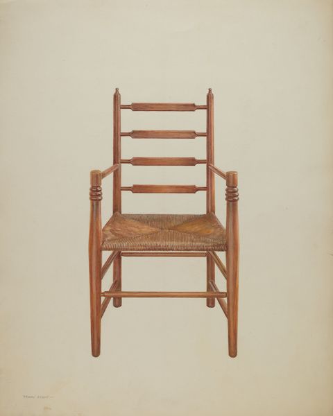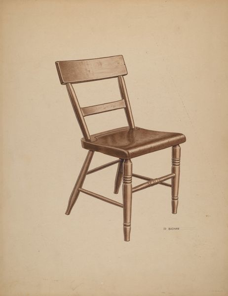 Editor: This is Alfred H. Smith's watercolor and graphite drawing of a "Shaker Rocking Chair," around 1937. I find its simplicity very striking. What do you make of the artist's approach to form here? Curator: The drawing emphasizes the chair's structural elements. Notice the linearity and repetition—the vertical posts, the horizontal slats—they create a grid-like structure. What about the light? Editor: The light source casts a strong shadow, and enhances the 3D aspect of the artwork. The color is subtle. Curator: Indeed. Smith's attention to shadow defines form, adding depth to an otherwise linear design. The light reinforces a spatial reading. Editor: Does the weave pattern play a role, beyond its texture? Curator: Certainly. The woven seat creates an interesting contrast. Its complex texture offsets the regularity of the wood frame. This provides a contrast between rectilinear and more organic. Editor: I'm learning a lot just by focusing on how Smith handled shape and shadow. Thank you. Curator: It is by deconstructing the relationships that make up form in Alfred H. Smith's work that we can start to see the artistry in everyday life.