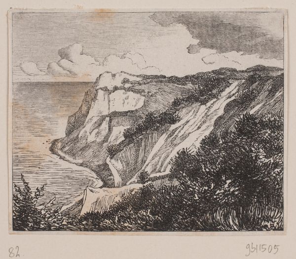 Editor: We’re looking at Franz Kobell’s ink drawing, "Waters in the Mountains." There's a real stillness to this piece, like time is holding its breath. The mountains and water are beautifully rendered, and the small figures kind of invite you into the scene. What catches your eye in this work? Curator: Oh, absolutely! You nailed the stillness; it’s almost a dreamlike quality. What grabs me is the tension between the detailed linework and the wash effect of the ink, almost dissolving into the paper. It's like Kobell is capturing not just a place, but a memory of a place, slightly faded at the edges. Notice how the architecture perches precariously on that high point; what thoughts does that evoke in you? Editor: It's like a castle in the sky, very romantic! Maybe a little foreboding, too, like a fairytale. But how much of that is the Romantic style coming through? Curator: A delicious question! The Romantic period definitely leans into the drama and emotion of nature. But look closer at how the lines themselves build up those cliffs, that slight asymmetry in the mountains – it’s less about perfect realism, and more about feeling the rough, wild beauty of the place. The figures are so small too - does that tell you anything? Editor: Well, they really emphasize the grandeur of the landscape! They almost seem like an afterthought. Curator: Precisely. It shrinks the importance of humankind! Makes us part of a bigger picture, a force far bigger than our daily worries. That tension, that interplay between humanity and untamed nature, makes my mind fill up with its mystery. What did this image spark in you? Editor: It definitely gave me a new appreciation for how much feeling can be expressed through simple lines and washes. Curator: Indeed. And how a simple drawing can invite such layered interpretations and feelings. It’s magic, isn't it?