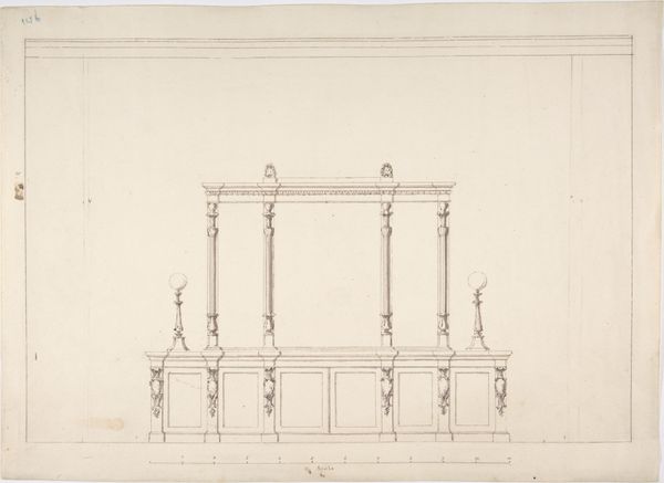 This is an anonymous design for a very large cabinet, made with pen and brown ink, with a grey wash on paper. At first glance, one is struck by the careful linearity and symmetry of the drawing, which reflects a controlled order and balance. The blueprint, or rather, design, is rendered with architectural precision, showing a detailed elevation view. The structure’s components are carefully delineated: classical columns, ornate friezes, and meticulously paneled sections. These carefully balanced components suggest an interest in not just function, but also the semiotic possibilities of form. The revival of Renaissance motifs points to a broader cultural interest in reclaiming a glorious past. This neoclassical structure, rendered in simple lines, reveals a world where form and order reign. It invites us to consider the deeper structures that inform our visual and cultural experiences.