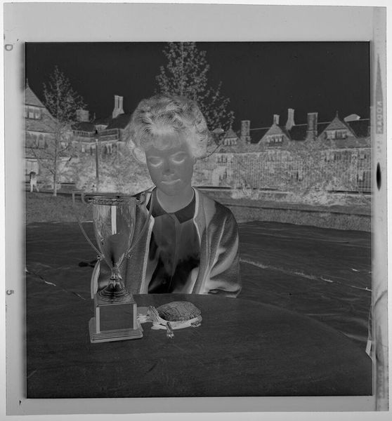 Editor: This is an untitled photograph by Jack Gould, showing a child with a turtle and a trophy. The negative image gives it a surreal quality. What do you make of this unusual composition? Curator: This image speaks volumes about constructed childhoods and societal expectations. The trophy, juxtaposed with the turtle, creates a strange tension. What kind of achievement are we celebrating, and at what cost? Editor: I hadn't thought about the contrast between those objects. It feels like a commentary on competition versus a slower, more natural pace. Curator: Precisely. The child’s passive pose, combined with the background architecture, suggests an environment of privilege, but also perhaps constraint. What power dynamics do you see at play here? Editor: That's really insightful. I'll definitely look at the photograph differently now. Curator: Excellent. It seems this image helps us consider how social structures shape individual experience and identity.