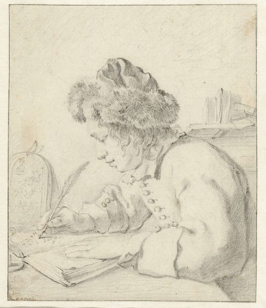 Curator: Ah, this drawing, “A Seated Scholar,” from the School of Rembrandt at Harvard Art Museums. It’s quite small, only about 12 by 9 centimeters. Editor: The first thing that strikes me is the mood—there’s something so intimate and contemplative in those lines. It feels like catching a glimpse of quiet genius at work. Curator: Right, and the way the artist uses a simple brown ink to create such depth and texture, especially in the scholar’s beard and the draped table. I'm thinking about Rembrandt's workshop—the circulation of ideas and techniques. Editor: It almost makes me yearn for a quiet corner, a good book, and maybe a ridiculously large hat. This image really captures the beauty of intellectual pursuit, or at least, the romanticized version of it. Curator: I am also reminded that images of scholars were important. Thinkers were the leaders and, in a way, the creatives, that helped shape society and culture. Editor: It's a reminder that even small drawings can hold such immense presence. Curator: Indeed, a tiny window into a world of thought.