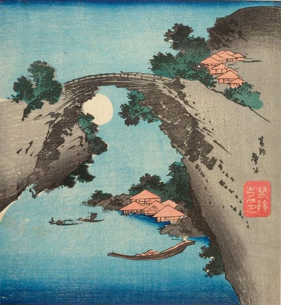 Curator: Kobayashi Kiyochika's print, "Advancing across the Ansong River at the Battle of Asan," presents a scene of dramatic conflict. Editor: The first thing that strikes me is the dynamic composition, how the artist uses overlapping shapes and a high horizon line to convey a sense of chaos. Curator: Indeed. Kiyochika, known as the last ukiyo-e master, captures a pivotal moment in the First Sino-Japanese War. The imagery of explosions, rendered as chrysanthemum-like bursts, juxtaposes beauty with the violence of war. What cultural memories do these forms awaken? Editor: The explosions also function structurally. The orange and yellows cut through the otherwise muted greys and blues, dividing the image and drawing the eye across the scene. Curator: Consider how the artist uses light – not just to depict the explosions, but to suggest a deeper, almost spectral presence over the scene. The symbolic weight here is heavy with loss. Editor: I appreciate how Kiyochika balances pictorial depth with flattened perspective. It adds a layer of artifice, reminding us that this is a constructed image, not a purely objective account. Curator: Ultimately, this artwork serves as a stark reminder of the human cost of conflict, viewed through the lens of cultural memory and symbolic representation. Editor: A striking example of how formal elements can amplify an artwork's emotional resonance.