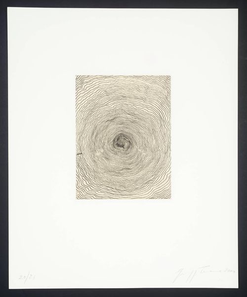 This is one of the twenty-three etchings that comprise the first volume of two portfolios, In a Spin, the Action of the World on Things I and II. Each etching was made by the artist in London 2002, printed on 350gsm Hahnmuhle paper, proofed and editioned at Hope (Sufferance) Press, London and published by Charles Booth-Clibborn under his imprint, The Paragon Press. There are sixty-eight sets of prints, numbered 1–68 on the colophon page, and six proof copies. Tate’s copy is the second in the edition. Each set is accompanied by a colophon page and presented in a box with an original spin painting in household paint on the cover and the title and artist’s name printed on top. In addition to etchings similar to those in the first volume, the second volume of In a Spin... includes a photograph of the night sky that Hirst took using a long exposure, recording the movement of the stars in the sky caused by the earth’s rotation, and contributing to the notion expressed in the words: the Action of the World on Things. The artist first coined this phrase in 1999, when he was explaining the origin of his spot paintings (see AR00498), differentiating two strands of his work: ‘an involvement with death and decay, and ideas and life: the action of the world on things exists somewhere, and the colour exists somewhere else. And it’s fantastic.’ (Quoted in Damien Hirst and Gordon Burn, On the Way to Work, London 2001, p.119.) In the event, the imagery of In a Spin, the Action of the World on Things I and II unites these two strands.