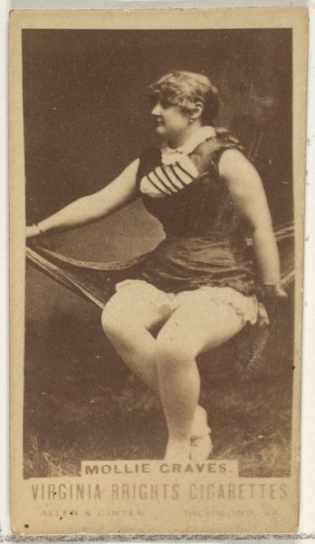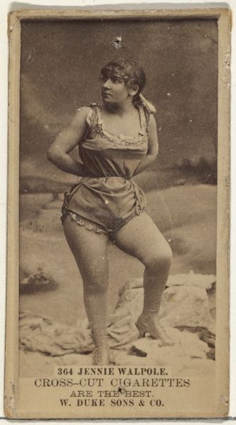 Editor: So, this is a print from the 1880s titled "Card Number 381, Sadie Coutelyou," part of the "Actors and Actresses" series, issued by Duke Sons & Co. It's actually an advertisement for cigarettes. The figure of the actress is very interesting - very poised and confident! I am wondering though, what might be going on beyond the surface of this commercial image? Curator: It's fascinating how consumer culture used these cards to disseminate imagery, isn’t it? Cigarette cards featuring actresses reveal much about the commodification of female performers and their role in shaping societal ideals of beauty and success. W. Duke, Sons & Co. leveraged popular figures like Sadie Coutelyou to connect with a broader audience, making smoking synonymous with sophistication and allure. Editor: So, this wasn't just about selling cigarettes; it was about selling an image, an aspiration. Were these images seen as promoting women in some way? Curator: In some ways, yes, though indirectly. These images gave actresses public recognition. Yet, the cards themselves were essentially vehicles for capitalist agendas. Consider the implications: their likeness becomes a readily available commodity. It raises critical questions about female representation and the economic structures influencing artistic production and reception during this period. What do you think is the key takeaway from this? Editor: I think it is that everyday commercial items can give scholars such insights into what a society valued at a particular time. Thanks! Curator: Indeed, and how those values are constructed and disseminated. A deeper understanding helps contextualize contemporary image politics.