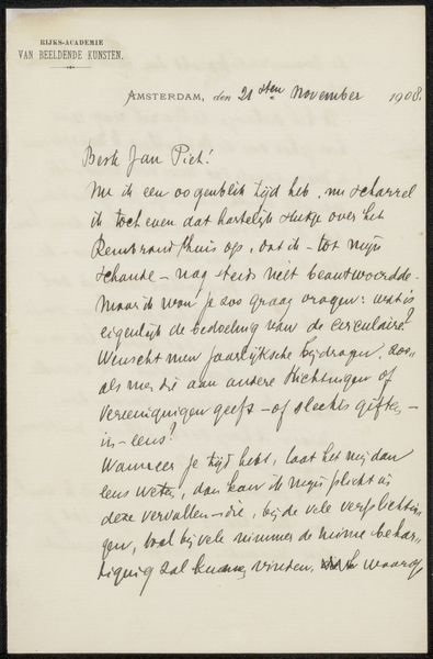 Curator: Before us is "Brief aan Jan Veth," a drawing potentially created between 1916 and 1923 by an artist affiliated with the Rijksakademie van Beeldende Kunsten. It appears to be a personal letter, rendered in pen and ink on paper. Editor: The flowing script gives it a rather intimate feel, doesn't it? It's not just informational; the handwriting adds personality and emotion. Curator: Indeed. The act of writing by hand, the choice of script – these were deliberate acts laden with social and personal meaning, reflecting status, education, and the nature of the relationship between sender and receiver. A printed document would convey something completely different. The imperfections, the varying pressure of the pen – these speak volumes. Editor: I’m drawn to how the ink almost seems to pool in places, giving a heavier visual weight to certain words or phrases. The darkness against the pale paper evokes a sense of the past, doesn't it? Letters hold within them their time and place. Curator: Precisely. A letter like this can be analyzed through the lens of correspondence theory, examining how it reinforces or subverts social norms. The opening salutation, the closing remarks—each element served a specific purpose. Also we could discuss this in line with access to type as a technology. Who had it, when, and what did it say about you. Editor: Looking at it, I am considering it is about congratulating Jan Veth becoming a grandfather. The references to the family resonate on a really deeply rooted level of imagery and ideas; what are the hopes and the role of the new generation. It gives you something optimistic and continuous even through a difficult or uncertain historical period, as well as creating these sorts of continuities between different times. Curator: Absolutely. Examining the text through a feminist lens, we might ask, whose voice is privileged here? Whose story is being told and from what perspective? Considering Anna’s involvement opens up questions about women's roles in early 20th-century society, even in supposedly personal correspondence. Editor: Thinking of Jan Veth specifically, there’s something here about artistic legacies. Curator: Absolutely. It shows just how rich and multi-layered a seemingly simple personal artifact can be. Editor: Indeed. A window into a past relationship between people, sure, but also between ourselves and history.