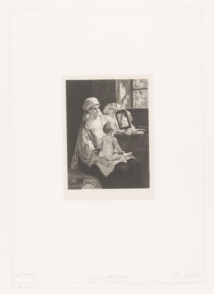 Curator: Jacob Spoel created this pencil drawing, titled "Bordurende vrouw," sometime between 1833 and 1863. It's currently housed here at the Rijksmuseum. Editor: My immediate response is one of intimacy and quiet domesticity. The limited grayscale palette and the focus on everyday activity creates a very gentle mood. Curator: It does. Genre painting like this, prevalent during that period, provides invaluable glimpses into the quotidian lives of ordinary people. We gain access to their domestic settings and customary practices through the politics of imagery embedded in this type of work. Editor: Exactly, and considering the socio-political context, this seemingly simple scene carries layers of meaning related to gender and labour. How might we interpret the act of embroidery as a reflection of a woman’s role within the family and the broader societal structures of the time? Was embroidery merely a pastime, or a form of resistance in itself, a subversion within the accepted activity? Curator: Precisely! Examining similar works reveals a complicated narrative, intertwining social expectation with female expression. The detail Spoel provides - the angle of the light, the texture of the fabric, her focussed gaze - are crucial. This reflects an increasing academic artistic emphasis on realist renderings of everyday subjects, thus influencing and shaping perception of women in society. Editor: And think about the child looking on. This adds an intergenerational component; observing, internalizing future social and gender expectations. What could that represent, in that historical context, within the realm of familial social dynamics? Curator: The location also factors into it: considering the setting, bathed in soft sunlight at what seems to be the doorway. How does that threshold relate to these figures’ place in the social hierarchy? The image can tell so much about what public and private spheres meant. Editor: Agreed, looking at it now makes one truly consider the unseen labour, expectations, and realities inherent in such imagery. Curator: Understanding art through a socio-historical lens really provides invaluable insight. Editor: It’s also incredible how that context amplifies the impact of what may, at first glance, seem a peaceful, quaint image.