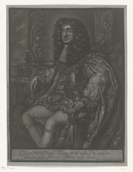 This portrait of Charles II, King of England, was made by John Faber the Younger, sometime around the first half of the 18th century. It’s a mezzotint, a printmaking technique that allows for rich tonal range, perfect for capturing the textures and details of the king's garments and surroundings. Mezzotint begins with roughening the entire plate with a tool called a rocker, creating a burr that holds ink. The printmaker then smooths areas to varying degrees, creating lighter tones. Look closely, and you’ll see how Faber used this method to render the sheen of the king's satin clothes, the weight of his velvet robe, and even the soft curls of his wig. The process of mezzotint is laborious, demanding meticulous skill and time. This investment of labor speaks to the importance of portraiture in asserting power and status. This wasn’t just an image; it was a carefully crafted representation of authority, intended to impress and persuade. Faber’s technical virtuosity elevated printmaking from a mere reproductive medium to a sophisticated art form, blurring the lines between craft and fine art.