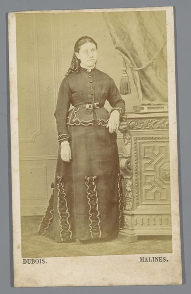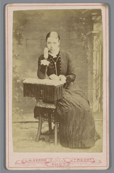 This is a photograph, likely a carte-de-visite, by Hermanus Jodocus Weesing, portraying an unknown woman, made using albumen print. The composition is vertically oriented, focusing on the figure posed against a neutral backdrop. Weesing employs a subdued tonal range, with soft contrasts which lend the image a somewhat melancholic feel. The woman is positioned asymmetrically, leaning slightly on a decorative pedestal to her right, balancing the visual weight with a small ornate chair on the opposite side. The careful arrangement of props and the woman's posture create a sense of stability and poise. In terms of semiotics, the woman’s clothing, the props, and her reserved demeanor all speak to the cultural codes of the period. The photograph encapsulates a moment in time, carefully constructed to convey particular social meanings related to identity and status. The sepia tones, the formal pose, all contribute to the photograph's function as a cultural artifact, reflecting both individual representation and broader societal values. As viewers, our interpretation is thus a process of decoding the layers of meaning embedded in its visual form.