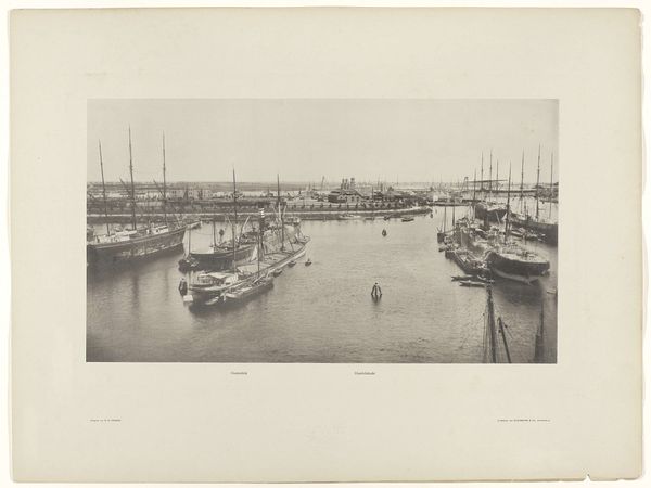Curator: This is John Thomson's photograph "Swatow," created in 1869, a gelatin-silver print. What are your initial thoughts? Editor: It's quite a subdued image, almost melancholic. The muted tones emphasize the stillness of the water and the rigid lines of the masts and buildings create a powerful geometric contrast with the organic chaos of daily life that seeps through the boats crammed near the shore. Curator: Exactly! Thomson was very interested in documenting the material conditions of different cultures. In Swatow, now Shantou, he captured the visual textures of global commerce. We have the stark industrial architecture paired with the numerous smaller vessels, signifying both local industries and expansive trade networks that affected all aspects of the image's production. Editor: The composition directs my attention to those very contrasts. See how those many small boats mirror the individual workers, their cultural import? It highlights a historical period in global trade, and prompts considerations around both collective cultural heritage and singular emotional resonance. Curator: Indeed, but looking beyond symbolism is equally interesting. How the image itself was materially produced: glass plate negatives, the chemical processes to make the print... Thomson needed resources and logistical support, so that context should be acknowledged as we unpack the cultural and historical narratives present. The print's surface, that delicate gelatin silver, reminds me of how fragile historical documentation truly is. Editor: Absolutely, it underscores the complex narrative encoded in every captured scene, and suggests multiple layers of individual narratives. Considering its aesthetic properties, light becomes a powerful symbol, casting meaning into our human experiences and reflecting both the physical and psychic worlds within us. It calls us to deeply reflect. Curator: Considering its visual language in conjunction with Thomson's background in the Royal Geographical Society, we must acknowledge he likely benefited from the exploitative practices endemic to this period, shaping his depictions. It provokes the consideration of whose stories are told. Editor: A thought provoking point! These images function as bridges between worlds, inviting us to recognize our connected history. Curator: I find the dialogue generated is crucial—the historical analysis should constantly re-evaluate itself. Editor: I agree, seeing it allows a richer sense of humanity.