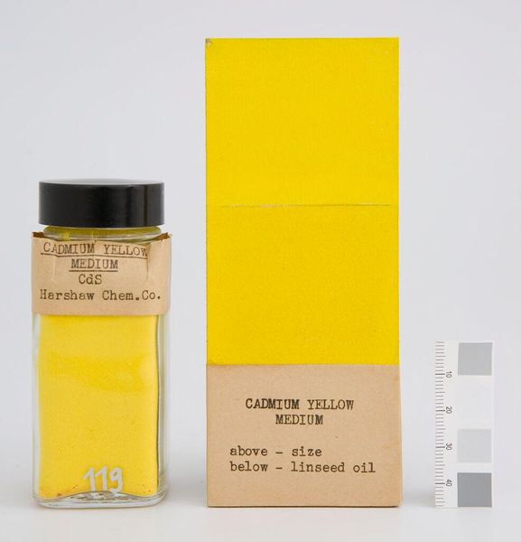 Curator: This is Cadmium-Barium Orange, a pigment sample manufactured by The Harshaw Chemical Company. Editor: Wow, that orange just vibrates! It's like bottled sunshine, so intense it almost feels edible. Curator: Indeed. We can see the Harshaw company produced a range of pigments, and this sample represents the industrialization of color. The label denotes its composition as cadmium sulfide and barium sulfate. Editor: It makes you think about the shift from natural dyes to these potent, lab-created hues. There's something unnerving and exciting in that leap. Curator: Precisely. The materiality is everything; consider its chemical components and Harshaw's crucial role in supplying artists with their materials. Editor: I keep returning to the sheer vibrancy. It's a color born not of nature but of pure, scientific intention. A little scary, but undeniably beautiful. Curator: A fitting sentiment, as we explore the evolving intersection of art, science, and industry. Editor: Yes, from earthy ochres to cadmium orange, a world of difference and a fascinating journey.