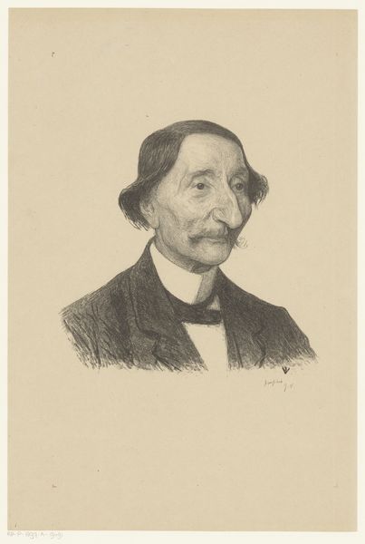 Curator: Let's discuss this portrait drawing, attributed to an anonymous artist after a photograph of Willem Witsen, and dating roughly from 1860 to 1915. It's a compelling piece in graphite and pencil, currently residing here at the Rijksmuseum. Editor: My first thought is of its intimate yet distant mood. The soft shading almost seems to veil the sitter, creating a sense of both presence and unknowability. Curator: The artist's application of pencil is indeed skillful. Notice how the delicate hatching defines the planes of the face and clothing, rendering depth with subtle gradations. The strategic use of light, particularly on the forehead and cheek, draws the eye and articulates the form. Editor: The mustache and bow tie, however, are so prominent; they can’t be accidental. A powerful moustache was a visual signifier of status and masculinity during the late 19th century, and a very specific archetype of manhood. We see it everywhere. This image carries echoes of that era, but subtly undermines them. It does invite thoughts about how social identities become crystallized—even fossilized—through repeated symbols. Curator: The choice of graphite and pencil itself adds to the work’s texture. Pencil lends itself to very accurate drawing, and with this choice of the artist we clearly have the impression that he strives to make an attempt for pure, direct representation. However, the lack of vibrant colour actually suggests the monochrome qualities associated with earlier photographic techniques. Editor: And what of Witsen himself? He wasn’t merely an anonymous face. Considering his role in Dutch artistic circles of that era—as a photographer, etcher, and writer, we cannot ignore this specific portrayal of his public self. What can this seemingly straight forward representation teach us about the act of self-portrayal and preservation of identity, through symbolic visual markers? Curator: Perhaps it's precisely the confluence of artistic skill, material expression and the symbolic context that creates such an impact. Through its technical execution and its symbolic allusions, the drawing exists at the junction of time and meaning. Editor: Yes, this is much more than just a representation. Its strength lies in its delicate balancing act, prompting conversations about portraiture, identity, and the endurance of visual language.