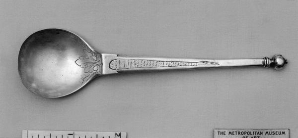 This silver spoon was crafted by Thomas Sibrand Hicht, likely in the late 17th or early 18th century. Notice how the spoon's smooth, reflective bowl contrasts with the detailed, textured handle. The handle, adorned with a foliate design and topped with an acorn, demonstrates Hicht’s adept craftsmanship. The spoon's curving form embodies a sense of restrained luxury. The material's inherent qualities communicate complex ideas about status and consumption in Dutch society. The intricate botanical details of the handle evoke notions of natural abundance. The very nature of the spoon—a tool for serving—speaks to the rituals of dining and social interaction. Consider how this object, both functional and decorative, challenges simple categorizations. The spoon serves not only as an instrument but also as a signifier of cultural values and aesthetic sensibilities.