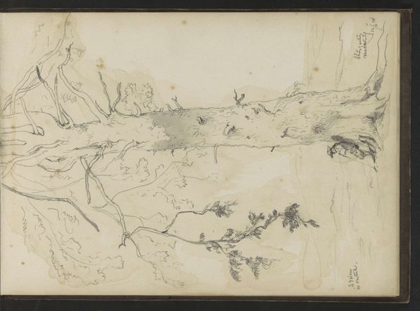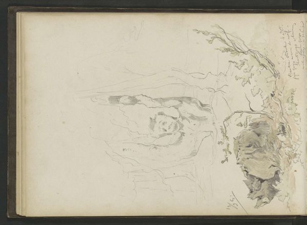 Editor: This drawing, titled "Paarden, hondenkoppen, een herder en een landschap," or "Horses, dog heads, a shepherd, and a landscape," was created by Johannes Tavenraat around 1840. It’s a pencil and colored pencil drawing held at the Rijksmuseum. It has a scattered quality. I'm struck by the contrast between the detailed landscape on the right and the much looser sketches of animals on the left page. How would you interpret this composition? Curator: Formally, the juxtaposition establishes a dialogue between representation and pure form. Observe how the artist manipulates line weight; on the left, quick, almost gestural strokes define the animal figures, focusing on essence rather than detail. Conversely, the right page exhibits a meticulous use of shading and contour to construct depth and texture in the landscape. Editor: So, the difference in technique emphasizes a contrast in the artist’s intention? Curator: Precisely. Consider the role of the negative space. The sketches rely heavily on the void to suggest form, creating a sense of lightness and movement. In contrast, the landscape utilizes hatching and cross-hatching to fill the space, thereby grounding the image and creating a sense of stability. How does this duality influence your reading of the overall piece? Editor: I see what you mean! The emptiness allows the animal figures to seem more dynamic. The landscape, more filled, appears settled. Perhaps the incompleteness of the sketches reflects the fleeting nature of observation versus the permanence of a remembered landscape. Curator: An insightful observation. By examining the formal elements—line, space, and composition—we gain a deeper understanding of the artist’s choices and the potential meanings embedded within this sketchbook page. Editor: Thank you. It is fascinating how analyzing just the visual aspects can be so revealing about the art.