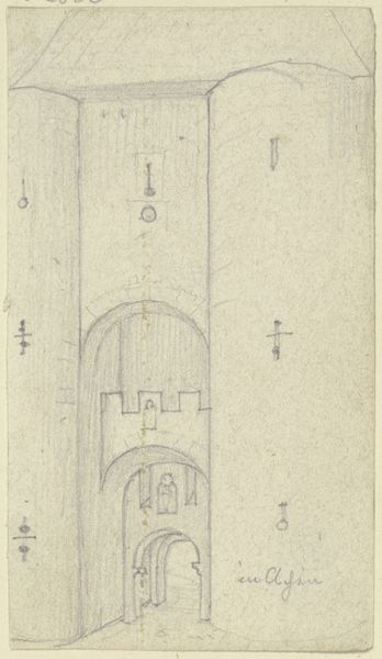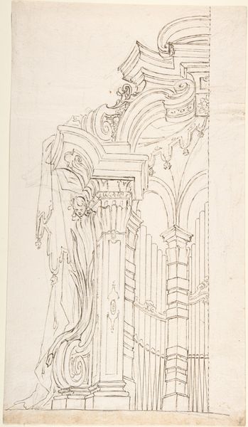 Curator: Before us is Karl Ballenberger's "Gothic Portal," a drawing residing here at the Städel Museum. It presents an architectural study, focused intently on form. Editor: Immediately, I'm struck by the delicacy of line. It’s almost ephemeral, like a ghostly imprint of monumental architecture rendered with quiet reverence using paper and drawing tools. Curator: Exactly. Let’s consider how the artist's focus isn't necessarily on capturing a specific structure, but on exploring geometric principles of Gothic design and spatial configurations that defined much of religious ideology at the time. The very notion of height was an expression of the Divine's domain. Editor: I see that clearly in the repeated arches, drawing the eye upward to where the structure almost fades at the very top. We can’t forget that drawings like this weren't always simply sketches. They are crucial documents of labor. Did Ballenberger consider how craft shapes identity? How architectural choices themselves reinforced gender or class distinctions in the communities for which such monuments were conceived? Curator: An incisive observation. These portals mediated access, reinforcing social hierarchies and regulating the flow of bodies and ideas within a structured religious context. This portal as depicted here could very well underscore access or a barrier according to religious laws. Editor: Thinking about the physical act of drawing, too, interests me here. The paper, the artist's hand. Even if the drawing remains detached, as a historical fragment, its presence raises vital questions about labor—Ballenberger's, certainly, but also that of the stonemasons who labored in precarity for such heights of artistic and social dominance. Curator: I agree, it prompts consideration of these artisans' contributions—often sidelined or deemed 'anonymous.' Re-evaluating historical accounts using this sketch urges an approach towards the agency and identity-building of said laborers as stakeholders through acts of material production. Editor: This architectural detail reveals not just geometric structures or an aesthetic system, but an entire ecology of making—social, material, historical, with all the uneven distributions of power at play. It asks how meaning itself accrues via the combined efforts of making and the act of representation. Curator: Indeed, our analysis encourages us to understand the artwork, its creator and subsequent beholders as complex players who contribute to societal discourse surrounding not just religion, but every possible identity marker connected therein. Editor: And for me, reflecting on the materials and the process grounds those complexities—revealing Gothic ambition as profoundly shaped by earthly conditions of labor, as we see translated in line and architectural shape within this subtle study.