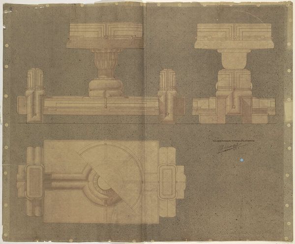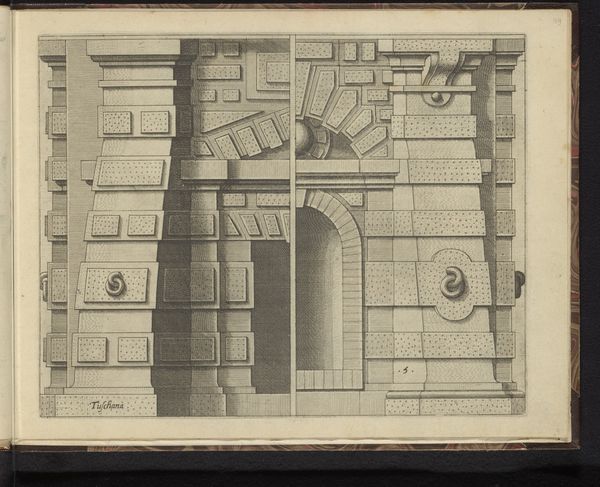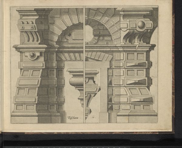 This print, "Twee Toscaanse hoofdgestellen en twee consoles," was created by Johannes or Lucas van Doetechum. The print presents architectural elements rendered with precision, reflecting the 16th-century interest in classical forms during the rise of the Renaissance. The focus on Tuscan order, known for its simplicity, speaks to the era's complex relationship with classical ideals, where proportion and order were highly valued as markers of civilization. Yet, this ideal was often juxtaposed with the social stratification of the time. Looking at the work now, we might consider the ways architecture, often seen as a symbol of power and permanence, intersects with broader social and political structures. The emotional impact lies in understanding how classical forms, while aesthetically pleasing, were often implicated in narratives of dominance and control.