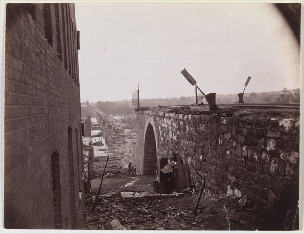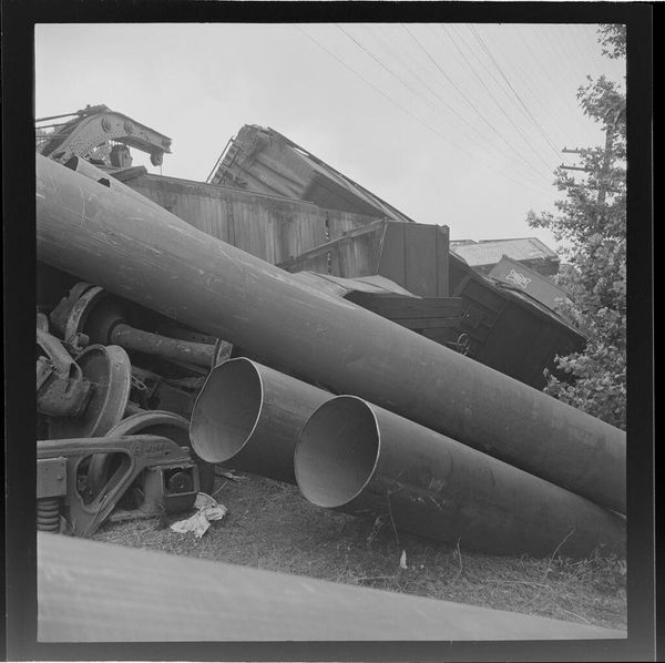 Editor: Here we have Jack Gould's photograph, "Untitled (train wreck)." It's a rather small gelatin silver print showing derailed train cars. What symbolic weight do you think this image carries? Curator: The wreck becomes a powerful symbol. Destruction of infrastructure often represents a breakdown in societal order, or perhaps even a questioning of progress itself. Consider the "Union Pacific" markings; what do they evoke for you? Editor: The Union Pacific suggests expansion and industry. So, its wreckage, the boxes strewn around, feels like interrupted movement, broken promises. Curator: Precisely. And the image also presents the telegraph poles in the background, resembling crosses. This evokes ideas of sacrifice, or a disruption of communication. Seeing all these symbols together, what resonates most with you now? Editor: It's like the photograph captures a moment of profound instability, a questioning of established narratives. Thank you, this was so insightful!