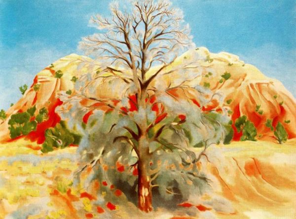 Georgia O'Keeffe made 'Cottonwood III' with oil paint, those strokes and how they sit together suggests she was really interested in the painting process. The painting captures a cluster of cottonwood trees beneath a gently sloping mountain range. The paint is applied in a way that feels both deliberate and intuitive. There’s this fascinating contrast between the fluidity of the washes in the sky and the more defined, almost sculptural quality of the foliage. The yellow-green hues of the trees seem to vibrate against the muted tones of the landscape, creating this intense sense of light and atmosphere. I love the way O'Keeffe uses color to create depth, especially in the foreground. The strokes here are blended, and the colors merge. For me this piece anticipates the later work of Agnes Martin, particularly in the subdued tonality of the desert landscape. O'Keeffe reminds us that art doesn't have to shout to be heard, that sometimes the quietest voices carry the most profound messages.