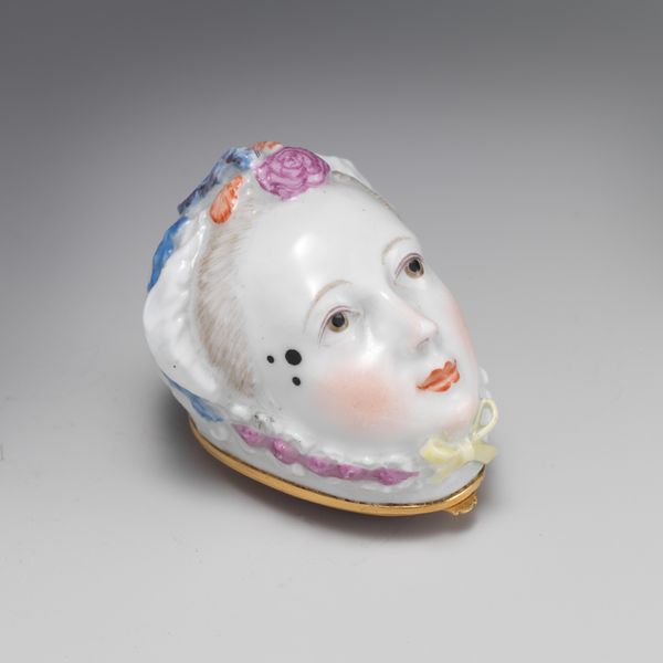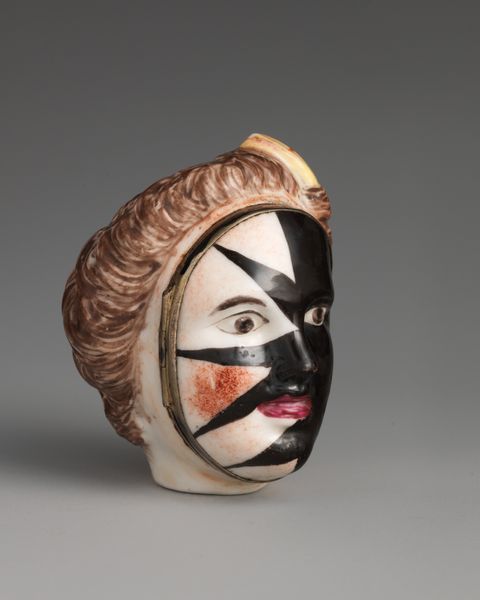 Curator: This unique creation is titled "Box in the Form of a Pug's Head," crafted around 1750 by the Meissen Porcelain Manufactory. Editor: Wow, a pug-shaped box. It's surprisingly intense, isn’t it? The face seems so serious. A peculiar choice for a decorative item, if you ask me. Curator: Well, in the 18th century, pugs were immensely popular among European nobility, symbolizing loyalty and luxury. This porcelain sculpture served not only as a functional container but also as a marker of social status. Its smooth surface and stylized realism reflected the rococo era’s embrace of ornamentation. Editor: It makes a certain sort of sense when you put it that way, the status thing. The craftsmanship is exquisite, though. Porcelain allows for a stunning level of detail, look at those slightly crossed eyes and even its tiny, adorable wrinkles. It captures that mournful pug expression perfectly. Makes you want to give him a biscuit. Curator: That's the marvel of Meissen porcelain. Their mastery in capturing realistic textures and lifelike features was unparalleled, embedding animals with a touch of humanity and emotional depth that captivated their patrons. Notice the precision in coloring; these hues are significant cultural markers, embodying ideas associated with wealth and access to costly artistic techniques. Editor: I get it now; he is quite luxurious for being made from refined ceramic. A peculiar status symbol for sure, although I now recognize some sentimental value within the craft itself. But all things considered, that pug probably held secrets as well, tucked away neatly, don't you think? Curator: Absolutely! It encapsulates a very specific historical moment, reflecting evolving attitudes toward pets and our fascination with preserving symbols of ourselves within domestic animals. Editor: Perhaps its intensity holds more layers of complexity than I initially perceived. Curator: Indeed, these relics encourage us to reimagine how cultural identities are formed and articulated. Editor: Food for thought, quite charming and valuable food for thought!