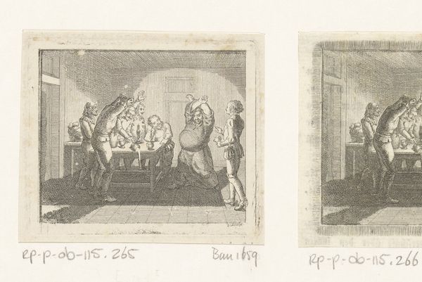 This print, Oliver Cromwell, by Daniel Nikolaus Chodowiecki, presents two interior scenes meticulously rendered with fine lines and a keen sense of space. The visual impact lies in the contrast between the architectural containment and the expressive gestures of the figures. In the left scene, the vaulted ceiling and imposing fireplace frame a group of men, one of whom stands isolated, his posture suggesting a moment of contemplation or confrontation. This isolation introduces a psychological element that disrupts the spatial harmony. On the right, another encounter unfolds around a table, highlighting the act of negotiation or agreement. Chodowiecki’s use of line not only defines form but also guides the viewer's eye, creating a narrative flow between the two scenes. Ultimately, the print’s power comes from its ability to evoke a sense of historical drama through formal means. The architectural lines and human forms become signs within a structured space, inviting interpretation beyond the immediate representation of historical events.