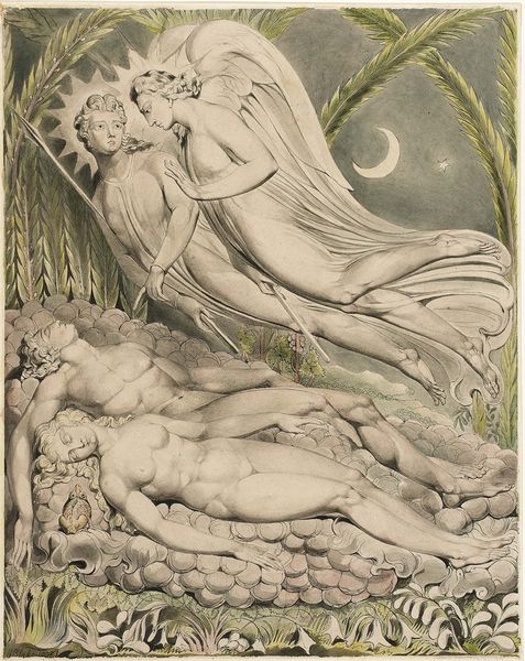Curator: "The Cup of Death," dating from around 1883-1884, is a compelling pencil drawing by Elihu Vedder. The visual weight immediately struck me—a remarkable command of tone creating depth within such a constrained palette. Editor: It has a definite atmosphere of sorrow, wouldn’t you say? The drooping posture of the figure accepting the cup, the shadowy figure presenting it – they resonate with cultural narratives surrounding mortality. Curator: Indeed. The composition invites immediate semiotic interpretation, particularly regarding the "angel" figure. Though winged, they lack any luminous halo, conveying an ambiguity around the gesture of giving this drink. Is it malevolent, or a form of bleak comfort? Editor: Consider the source text incorporated directly within the image: "So when the Angel of the darker Drink… invite your Soul forth to your Lips to quaff." The verses shape a clear symbolic narrative—Vedder seems deeply concerned with concepts of destiny and surrender to the inevitable. Curator: Vedder's employment of classical Academic artistic conventions underscores these themes, no? He deliberately invokes certain aesthetic languages to emphasize themes of morality that appear so commonly throughout his oeuvre. Editor: That contrast between classical aesthetics and morbid symbolism is precisely where its power resides. We are drawn to beautiful forms representing unsettling realities, tapping into a deep collective awareness. It reminds one of symbolist poetry, enacting themes through complex layering of metaphor. Curator: In a sense, it encapsulates how potent the human form is within visual language. Even through minimal artistic means, profound themes manifest if composition and the rendering of tone are so masterfully observed. Editor: I concur. Seeing such heavy meaning distilled with delicate pencils only underscores how artists reveal complex emotions with fundamental formal choices, a dialogue that echoes throughout history.