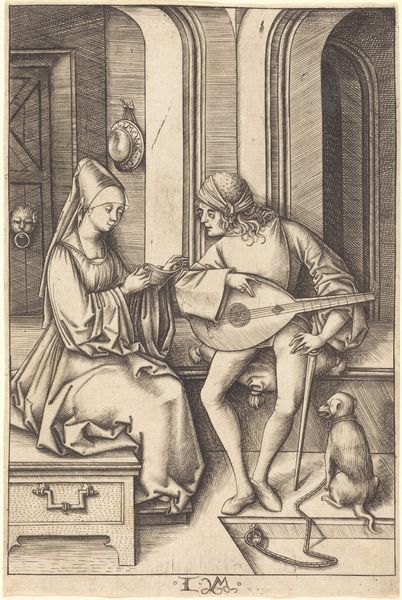 Israhel van Meckenem created this engraving, "The Lute Player and the Harpist," in the late 15th century using a technique that demanded meticulous labor. The process began with a metal plate, likely copper, into which the design was incised with a tool called a burin. The artist would have painstakingly carved lines to create the image, with deeper cuts resulting in darker lines when printed. The plate was then inked, and the surface wiped clean, leaving ink only in the engraved lines. Finally, it was pressed onto paper, transferring the image. The dense, cross-hatched lines visible on the figures’ garments and in the architectural details demonstrate Meckenem's mastery of the technique. This print wasn't just a picture; it was a product of skilled handwork, reflecting the value placed on craftsmanship during the period. The very act of creating such a detailed print elevated it beyond mere decoration, infusing it with cultural and social significance. The amount of work involved challenges the traditional distinctions between fine art and craft.