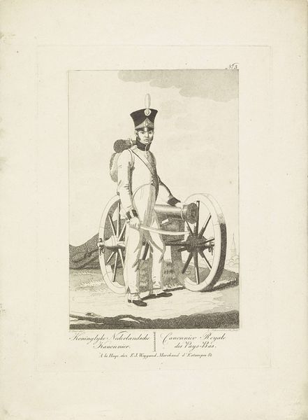 Editor: This engraving, "Twee militairen van een linieregiment, 1814-1818" by Leonardus Schweickhardt, showcases two soldiers. There's a stillness to it, a formality even. What details stand out to you? Curator: The most compelling feature is the almost casual juxtaposition of the figures against their rather rigid attire and armament. Do you see how the standing soldier, with his ramrod-straight posture and polished rifle, contrasts with his comrade, who sits at ease, smoking a pipe? It creates a subtle tension between duty and repose. These elements become visual anchors connecting us to the mindset of the era. Editor: That contrast is really interesting. So the symbols tell a story beyond just the image itself? Curator: Absolutely. Consider the uniformity of their dress. These aren’t just men, they are representatives, emblems of the Kingdom and all the cultural weight that it bears after emerging from Napoleonic rule. Notice, too, the clean lines and almost idealized features; the very essence of Neoclassical order imposed upon a military subject, perhaps masking the true human cost of conflict? The image attempts to glorify and sanitize. What feeling does that provoke in you? Editor: It makes me wonder about the psychological impact of conforming to that image, suppressing individual emotions for the sake of national identity. It is a kind of cost of service not represented literally but implied symbolically. Curator: Precisely! Schweickhardt’s engraving allows us to explore this complex interplay between the individual and the collective, the seen and unseen. Through such symbolism, we can perceive the lasting echoes of history resonating within these images. Editor: It is fascinating how much this seemingly simple portrait reveals once we start to decode its visual language. I now have many clues and insights on what details to research further.