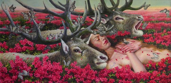 Curator: It's funny, my immediate response is drowsiness. It has a quality of sleepy surrender, and a dash of something wild around the edges. Editor: Indeed! We’re looking at Jana Brike’s "The Cradle," an oil painting created in 2020. Brike, known for her blend of Romanticism and fantasy, invites us into a space that feels both dreamlike and intensely personal. The subject appears to be nestled between floral ornamentation and what looks like wolves or wolf-like dogs. What does that make you feel? Curator: Calm and yet maybe a little sad? The flowers around her face, one actually placed right into the corner of her eye, and the dreamy state – it hints at the vulnerability and fragility we carry within us and how sometimes those need safe protection in a sort of melancholic hibernation. Editor: I read that protection as resistance too. Think about the symbolism of the wolf, often demonized but also revered across cultures as a symbol of independence, resilience, and a deep connection to the natural world. The flowers disrupt any expectation of conventional beauty; some seem to obscure or even challenge the viewer's gaze, which to me says something about reclaiming narratives and challenging established, and, frankly, patriarchal, views of femininity. The detail is incredibly rich and complex. Curator: The tapestry on her bodice certainly looks like traditional ornamentation... It could signify an appeal to roots, to ancient female knowledge? Though I’d argue, even if there is a political statement to it, that "patriarchal view of femininity" you mention, the painting mostly speaks of a singular intimate inner realm where resistance takes a back seat, if just for a nap, to a surrender of sorts to dreaming. There's beauty in the passivity it transmits. Editor: That’s an interesting reading! Maybe the personal IS political here and Jana Brike lets us into both, asking if these need to oppose each other in the first place? It really does offer up endless interpretations. Curator: And endless spaces to wander around with your thoughts, half asleep, half alert. A very welcome invitation.