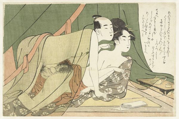 Katsukawa Shunchō produced this woodblock print of entwined lovers in Japan, most likely in the late 18th century. It's an example of ukiyo-e, which means 'pictures of the floating world'. These images often depicted scenes of everyday life, landscapes, and, famously, the pleasure quarters. The image presents an intimate moment, but it also speaks to broader social dynamics. During the Edo period, Japan experienced economic growth and urbanization, leading to a flourishing merchant class. Ukiyo-e prints catered to this new audience, offering them affordable and accessible art that reflected their interests and desires. Prints like this one were part of a vibrant popular culture that challenged the rigid social hierarchies of the time. Understanding the social context of ukiyo-e requires looking at a range of sources, from historical accounts of the period to the prints themselves. It's through this kind of research that we can gain a deeper appreciation for the complex relationship between art and society.
