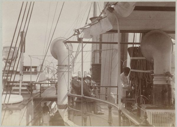 Editor: So, here we have "Passengers on the deck of the boat between Queensborough and Vlissingen," a photograph, probably from 1889, by Henry Pauw van Wieldrecht. It's an albumen print, showing people on a ship deck. What strikes me is the separation, how solitary each person seems despite being in a shared space. What do you see in this piece? Curator: It's compelling how the composition highlights this sense of detached existence. Looking at this, I'm immediately drawn to the themes of colonialism and social class. These passengers are traveling between nations, indicative of a connected world, but who gets to participate in this global exchange? Who could afford this journey, and whose labor made it possible? Editor: That's an interesting perspective I hadn't considered. The figures seem almost indifferent to their surroundings, lost in their own worlds. Is it possible this reveals some societal commentary? Curator: Absolutely. Consider the backdrop: shipbuilding, industry, these pipes…They reek of labor and empire, right? Who directly profits from the ships? Think about who is omitted. I wonder what their stories are, what opportunities were denied to them so others could embark on travels for leisure or capital gain? Editor: That's such a powerful interpretation. Thinking about it now, I see the picture far differently. There are clear societal divisions, not just people taking a boat trip. Curator: Precisely! And in realism we can often find that political message by looking at who's in the frame and more importantly, who is systematically kept outside the frame. The artist prompts us to investigate beyond the mere image. Who is unseen? Editor: This reframes the photograph for me. It’s a prompt for critical reflection. Curator: Exactly. Art like this is meant to push us beyond face value to recognize, discuss and transform social realities. Editor: This was incredibly insightful. I’ll never look at similar photographs the same way. Curator: And that's the power of art! It encourages us to be actively engaged in understanding our shared history.