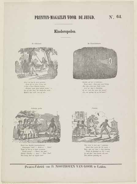 This is an engraving titled "Kinderdeugden" or "Children's Virtues" produced by D. Noothoven van Goor, a print factory in Leiden. It likely dates to the 19th century, a period when the Netherlands was undergoing significant social and economic changes. The print is divided into four vignettes, each depicting a different virtue. These scenes offer a glimpse into the values that were considered important for children in that era. This artwork underscores the role of printed media in shaping social norms and moral education. Print factories emerged during this time, reflecting the rise of mass communication and its influence on public opinion. The title, "Prenten-Magazijn voor de Jeugd" or "Print Magazine for Youth," further indicates that this print was likely part of a broader publication aimed at young audiences. Understanding the social and institutional context in which this print was produced allows us to decipher its messages more effectively. By consulting historical archives and publications from the time, we can gain deeper insights into the values and ideologies that shaped Dutch society and culture.