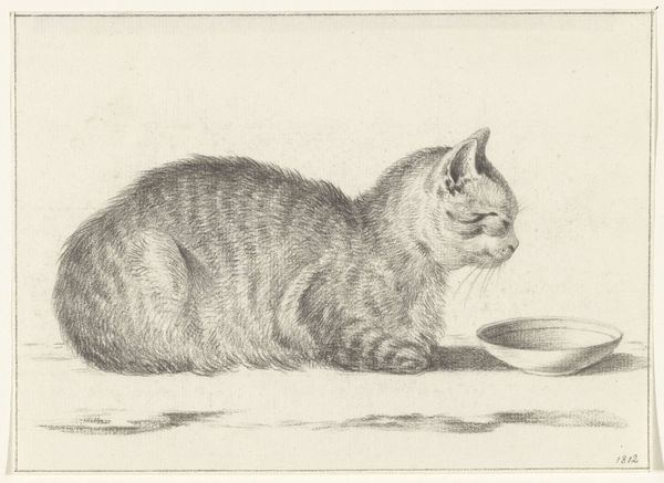 Jean Bernard created this delicate drawing of a resting cat. It was made during a transformative period in European history. Bernard, who lived through the French Revolution and the Napoleonic era, witnessed profound shifts in society and governance. During this time there was a growing interest in naturalism and the everyday. The intimacy of the drawing, its quiet focus on a domestic animal, reflect a broader cultural movement towards valuing personal experience and observation. Unlike grand historical paintings, this drawing celebrates the beauty of the mundane. The cat, a creature often associated with independence and mystery, rests in quiet repose, seemingly oblivious to the societal upheavals. Bernard draws attention to the intimate and personal, offering us a space for contemplation amidst the broader scope of history. This drawing serves as a reminder of the small moments that persist, even in times of great change.