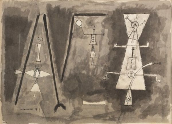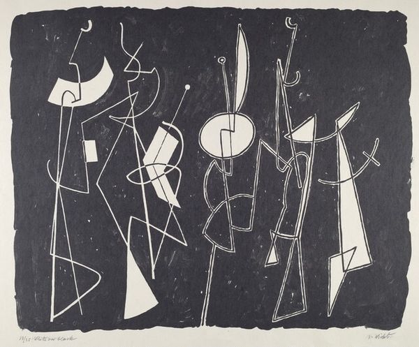 Curator: We are looking at "Figures in Landscape," an etching and graphite print created in 1956 by Dorothy Dehner. Editor: There's a curious tension in this piece. I see angular forms rendered with delicate, almost hesitant lines, creating a dreamlike, unsettling atmosphere. Curator: Dehner was part of the burgeoning New York art scene after World War II, closely linked to Abstract Expressionism, but resistant to easy categorization. The "landscape," in her work, is often a psychological space reflecting personal turmoil. Editor: The figures, if we can call them that, seem more like abstracted totems or perhaps diagrammatic beings. How do their shapes interact, and what meaning is derived through these arrangements of shapes? Curator: Consider the broader historical context. Dehner navigated a male-dominated art world and a complex marriage to sculptor David Smith. Her exploration of abstraction, incorporating personal narratives, resonated with a generation grappling with identity and trauma in the postwar era. This print was made around when her husband's star was rising, and hers wasn't quite in the same orbit. Editor: Yes, these geometric forms project an inner reality. Take for instance that juxtaposition of vertical lines with soft washes and detailed accents. Each form plays a vital role in constructing meaning. Curator: You know, one interpretation I’ve often considered: is Dehner playing with our sense of perspective and expectations by invoking historical symbols like 'landscape' and 'figures', then undercutting them? Her modernist engagement asks us what public art means and does, then offers very private hints as the substance of an answer. Editor: An insightful analysis. I agree—there is more going on in this ostensibly simple composition than meets the eye. What strikes me is that the artist challenges the relationship of parts to the whole, producing unresolved tensions. Curator: Precisely! Dehner uses the public expectation of accessible themes to draw us into much more vulnerable territory, reflecting the zeitgeist of social reckoning and exploration through modern visual terms. Editor: Ultimately, the beauty of this piece lies in the visual and interpretive challenges it gives us. Curator: Indeed; Dehner compels us to reconsider how abstraction intersects with socio-political and individual stories, challenging the conventional roles assigned to art and female artists.