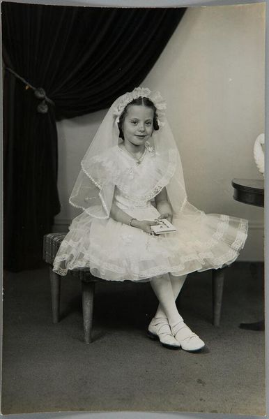 Editor: So this is an "Untitled" photo by John Deusing. It looks like a First Communion portrait, judging by the veil and the bible. It feels so staged, almost dreamlike, don’t you think? What jumps out at you? Curator: It’s funny you say "dreamlike," because to me it feels like a memory trying to surface. That sepia tone does that, doesn't it? But what I see here is not just a girl in white, but the weight of tradition, the poised innocence that's carefully constructed for the camera. Editor: Constructed? Curator: Absolutely. Look at how everything is arranged, the way she holds the rosary, even the placement of the table. It’s a performance, a moment captured and immortalized. Does that change how you see it? Editor: Definitely. It makes me wonder what she’s thinking behind that pose. It’s like a little time capsule of a very specific cultural moment. Curator: Precisely. Art is a mirror reflecting our own hopes, dreams, and, yes, performances.