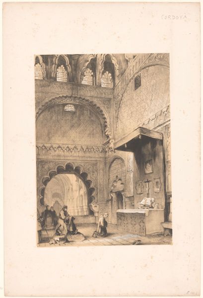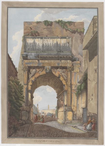 Wijnand Jan Joseph Nuijen made this watercolor, "Rue du Gros Horloge, Rouen," using muted shades of brown and gray. This was a popular medium for sketches and preliminary studies, offering immediacy and portability. Nuijen’s mastery is evident in the subtle gradations of tone and the delicate rendering of architectural details. The clock tower looms over the street, its intricate carvings and monumental scale captured with impressive accuracy, and its implied relationship to the cathedral behind. The overall effect is one of atmospheric depth. Watercolor allowed Nuijen to capture the transient effects of light and shadow on the buildings, and the bustling street life below. Look closely, and you’ll notice he has also added a sense of social context, with figures depicted selling wares and going about their daily routines. The use of watercolor lends a sense of immediacy to the scene. Ultimately, this work exemplifies the intersection of fine art and everyday life. By focusing on materials, making, and context, we can fully appreciate Nuijen’s skill and vision.