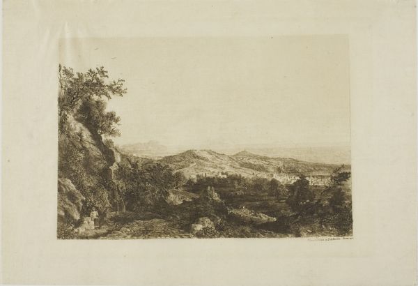 Curator: What a beautifully rendered landscape; it's peaceful, almost dreamlike. Editor: It is indeed. This is "Landscape with Wooded Hills, Seated Figure," created around 1756 by Nicolaes Emmanuel Perij. It's an etching printed in ink on paper. I find it fascinating to consider the socio-economic factors at play. The paper, ink, and the printing press itself, all represent layers of industrial processes and material consumption available to artists in the mid-18th century. Curator: Absolutely. And Perij masterfully utilizes those materials. Look at the lines! The meticulous detail in the trees and the subtle shading of the hills – it’s all so delicately executed. He captures form so elegantly using line. Note the almost feathery lightness in the clouds versus the denser texture used to render the rocks. Editor: Yes, and the composition implies an entire network of labour—from paper production to distribution. Someone had to make that paper, transport the ink. Then, of course, there's Perij himself; the engraver learning a trade that had cultural prestige even while relying on material outputs for production. We need to examine how that artistic labour functioned in 18th century markets. Curator: I see your point, and it does prompt fascinating lines of inquiry. But the eye is so expertly guided through the composition! The lone seated figure—seemingly lost in thought—adds such a sense of scale and solitude, while that line guides our gaze back to the artist’s emblem on the hill. And this careful rendering, creating depth, mood and composition, suggests more than mere illustration. Editor: Perhaps, though these aesthetic qualities were commodities too. That atmospheric perspective wasn’t separate from the societal value that landscapes commanded, the colonial gaze always informing their perspective, from the material production, all the way up to the lines themselves. Curator: A sobering thought, certainly, and a welcome change of perspective, when all too often one loses oneself merely in visual beauty. Editor: Indeed. Thinking of art as always a reflection of labour practices makes these quiet, intimate moments depicted on the landscape feel newly rich, don’t you think?