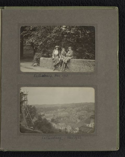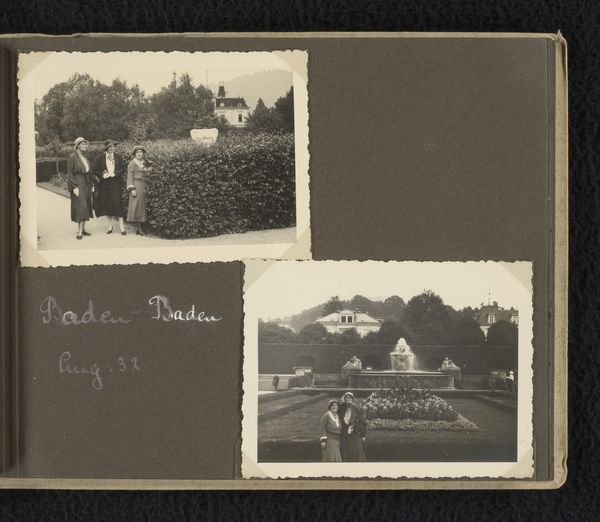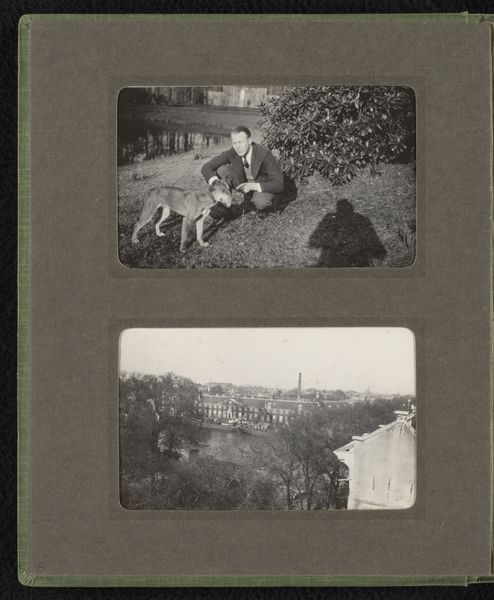 Curator: Here we have a charming photographic piece dating from 1930 to 1931, entitled "Echtpaar Berti Hoppe en Herman Besselaar in het Prater te Wenen en een stadsgezicht van Mödling," or translated, "Married Couple Berti Hoppe and Herman Besselaar in the Prater in Vienna and a cityscape of Mödling." Editor: My immediate impression is one of understated elegance and melancholy. The monochrome tones give it a sense of timelessness, but also, a quiet sadness. It is not, however, hopeless sadness, but rather the melancholy often caused by witnessing human fragility and fleeting nature, something particularly acute, of course, for those interwar years. Curator: Indeed. Note how Hoppe and Besselaar are posed—at a table, in partial sunlight. It captures a cultural memory tied to interwar Europe; a time of elegance contrasted by increasing austerity, especially with the looming financial pressures after the crash in '29. What symbolism might be at work here? Editor: Considering its historical moment, the choice of setting, I believe, takes on extra significance. They are photographed in Prater, a large public park, juxtaposed next to Mödling. It brings up questions about what constitutes private versus public identity at that historical conjuncture. The very construction of gender at this time was, in part, also a public debate. Who were Hoppe and Besselaar in the domestic versus the public sphere? Curator: This photograph certainly evokes a narrative ripe with potential questions about public life at the time, while the second smaller photograph included beside this image anchors it within familiar imagery of Central European domesticity. A snapshot within a family album. Editor: Exactly. Moreover, one must wonder what it meant to present this bourgeois vision against a Europe on the brink, rife with political tensions—particularly the anxieties about gender, identity, and belonging as new political actors gained prominence. Did they want to document a private identity, hoping that these portraits and views will outlast turbulent times? Curator: A very insightful point. Photography, like many other forms of representation, carries layers of cultural and political meanings, both intended and unintended, of course. Looking closely helps unlock them. Editor: Agreed. Visual artifacts from the interwar years can teach us much about individuals grappling with shifting identities against great upheavals. Curator: It certainly is a layered image worth exploring further. Thank you. Editor: My pleasure. Thank you for shedding light on Hoppe and Besselaar.